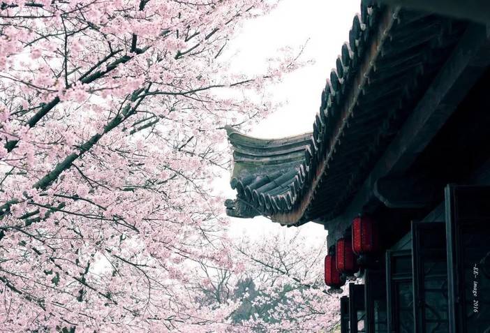 望不到边的粉色浪漫与典雅精致、古朴纯净的江南园林景致格外搭调。乳白色的烟雨中,融化着不尽的哀伤愁绪。