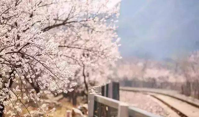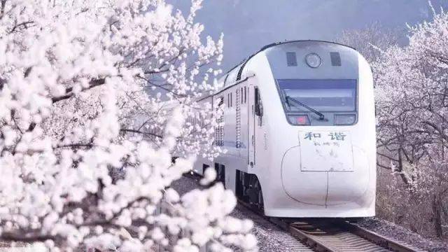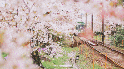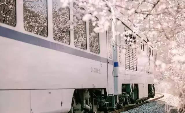 列车穿过樱花隧道缓缓驶来,一个转弯,映入眼帘的不仅是布满枝头的浪漫,还有空中扬起的无数花瓣。