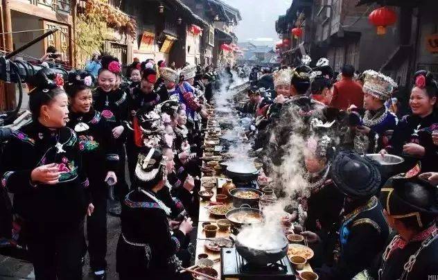还有当地特色的长桌宴,长桌宴是苗族宴席的最高形式与隆重礼仪,左边是主人座位,右边是客人座位,主客相对,敬酒劝饮并对酒高歌,好不热闹。