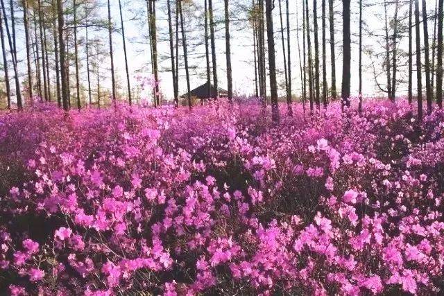 “石海”周围生长着连绵十几里的兴安杜鹃林。每年5月中旬,杜鹃花恣意绽放,石在花中,花在石上。