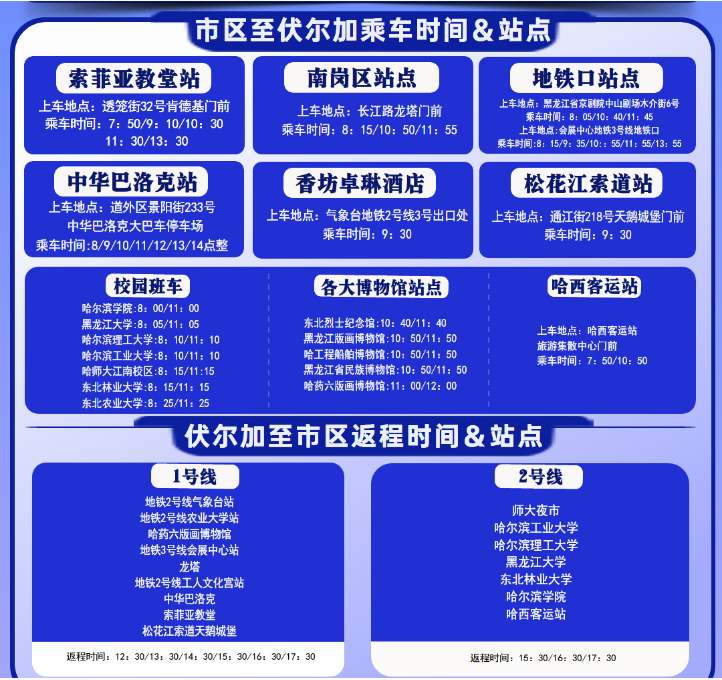 1.起止:哈尔滨西客运站(旅游集散中心)-伏尔加庄园
