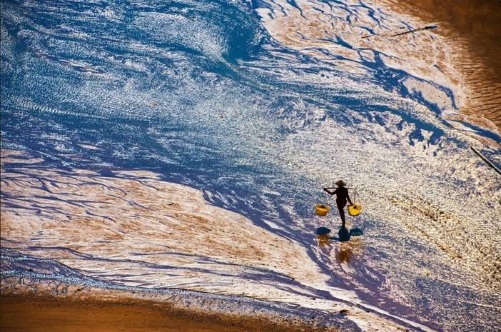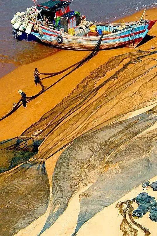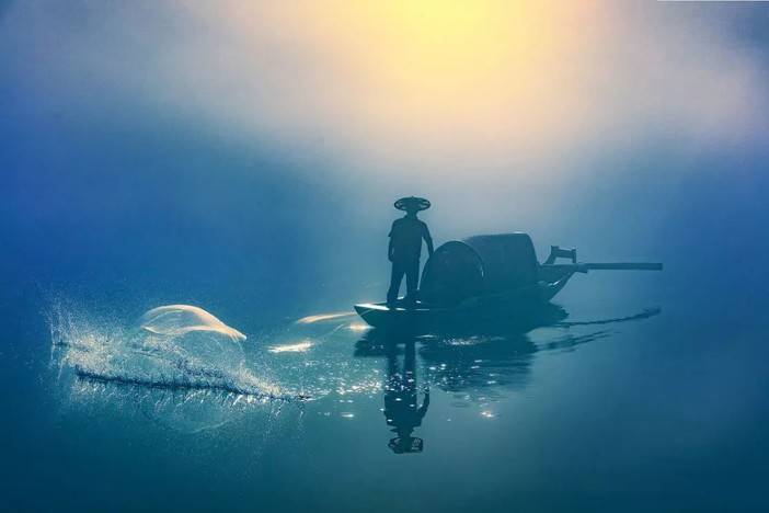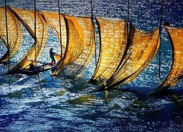 一叶小舟划破宁静的海面,载着那被镀上一层古铜色光泽的渔民,带着一串涟漪滑进金色的光影,且行且吟。