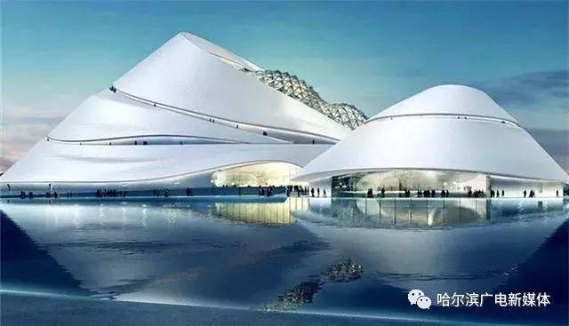 在哈尔滨的母亲河松花江边,异型双曲面的外型设计让整个建筑与松花江融为一体。