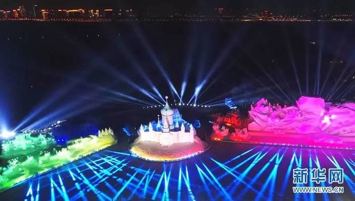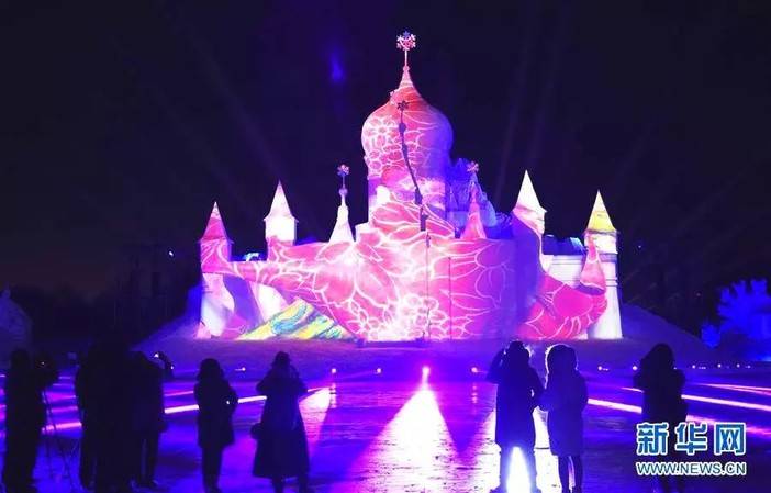 《雪舞间》将声、光、电与大型雪塑实景结合,打造神奇魔幻光影世界,为冰城夜空再添绚丽色彩。