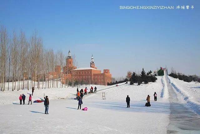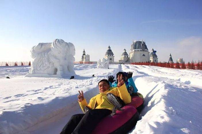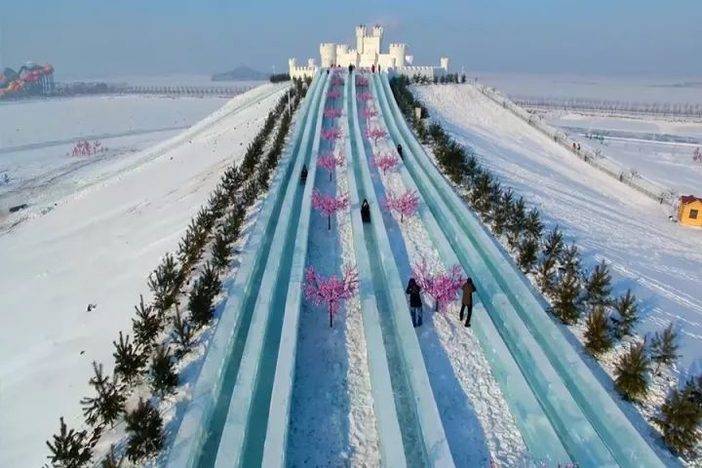 这里有一座全国最大的人造冰山。一条条冰滑梯从山上直抵山下,长达500多米,坡度15°,50秒就可滑到底。