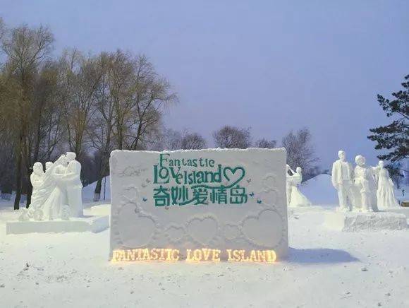 岛上有一片占地达200余平方米的爱情主题雪雕群。