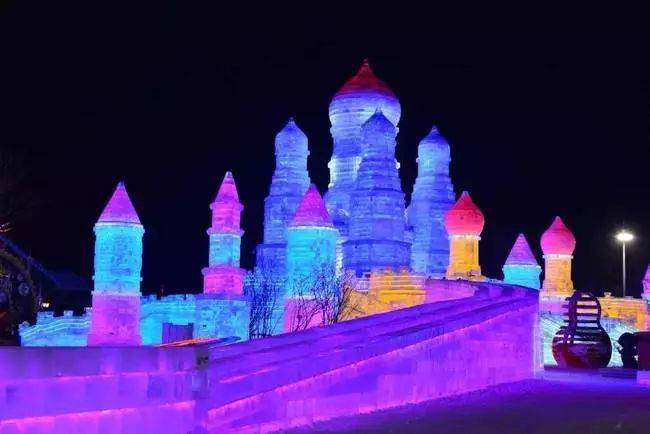 到了晚上,冰灯亮起来了,洁白的冰雪世界,变成了一个五彩斑斓的梦幻乐园。