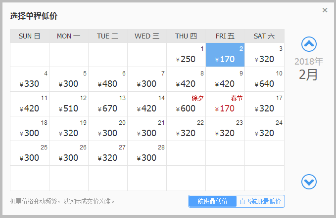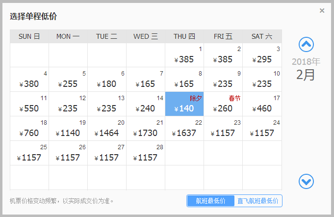 最低价是除夕那天,140元,但其实2月7日、2月8日出发也不错,只要165元!