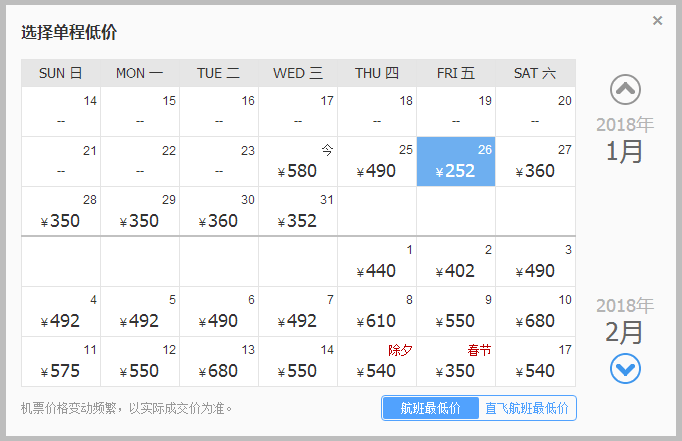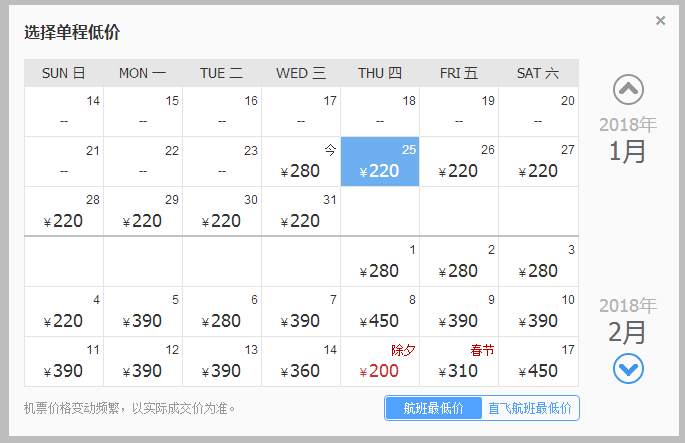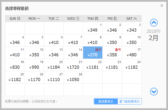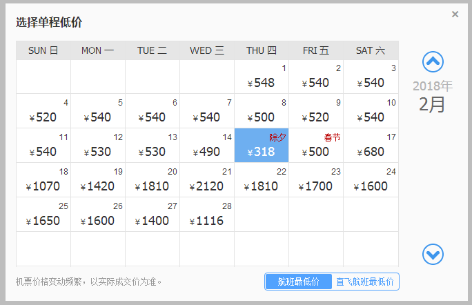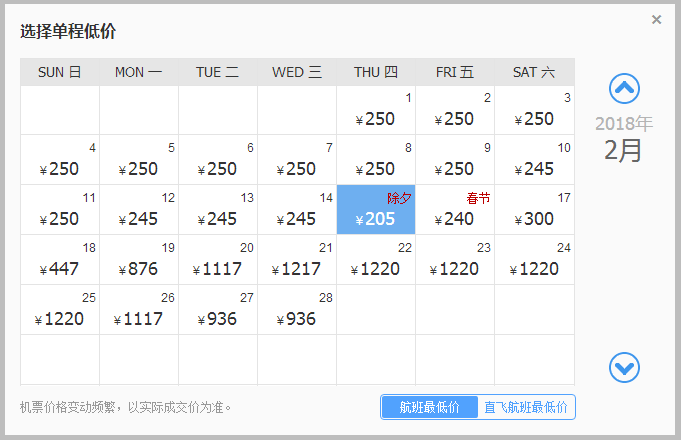 最低价是除夕当天,205元。但也有不少时间机票只要250元左右,选择性还是很大的。