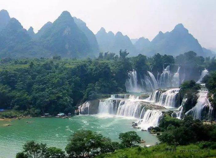 德天瀑布雄奇瑰丽,变幻多姿,瀑布河水时急时缓,迂回曲折于参天古木间。
