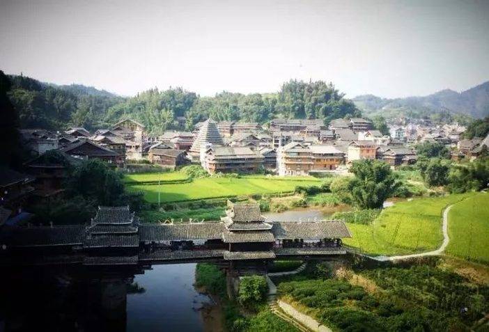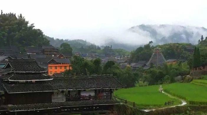 周围青山绿树环绕,完好地保存着侗族的木楼建筑,景色优美。