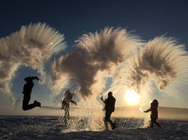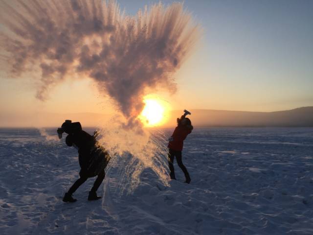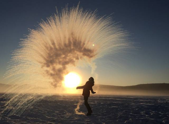 拿瓶热水向天空泼出去