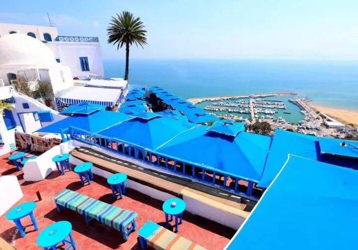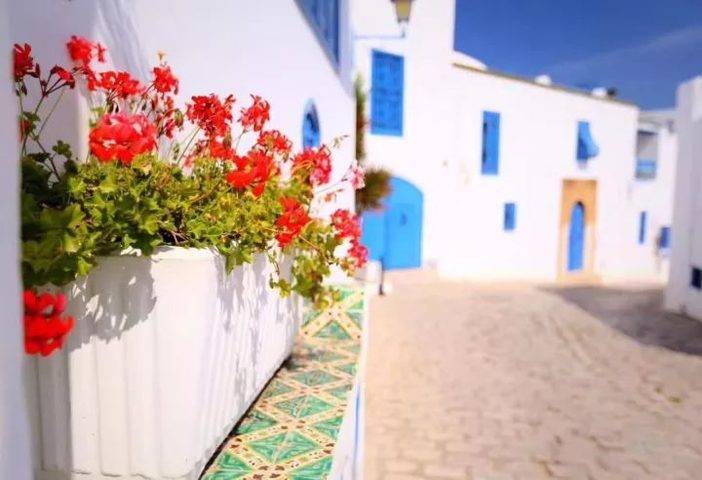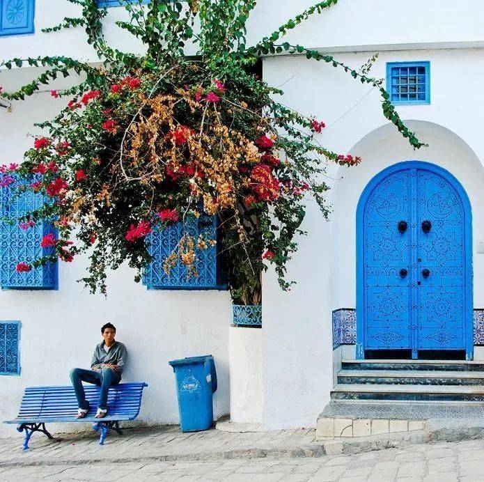 白色的墙和蓝色的门窗,是这个蓝白小镇的全部颜色,静静坐落在突尼斯海湾的边上,透着阳光全是浪漫的色调。