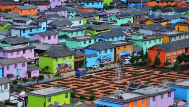 不出国门,丽江也有一座五彩之地,位于丽江古城区七河镇金龙村的九色玫瑰小镇,442栋房子用9种色彩,组成了一个童话中的五彩世界。