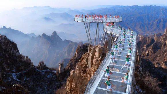 这座悬空跨度32.8米的观景台,比美国科罗拉多大峡谷的廊桥还长11.4米,434平米的载员面积,是迄今为止世界上面积最大的观景平台。