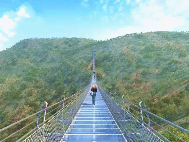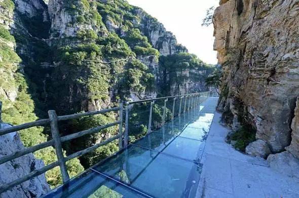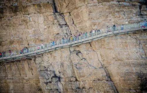 从红崖山脚下向山上攀登,行至山腰,桥梁会渐渐露出全貌。桥面采用玻璃铺砌而成,行人走在桥上,仿佛空中漫步!