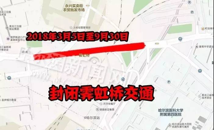 为配合霁虹桥文物保护和哈站南广场工程的施工,保障施工期间道路交通安全,从3月5日起,哈市将封闭霁虹桥和哈站南广场区域部分道路的交通,并对施工区域周边道路交通流量进行调整。