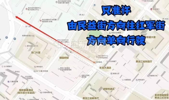 ▲电车街(尚志大街至地段街),只准许由尚志大街方向往地段街方向单向行驶。