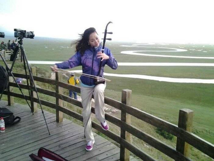等待拍日落的美女脱下军大衣,拿起二胡,演奏一曲《天路》。这又何尝不是一道美丽的风景!