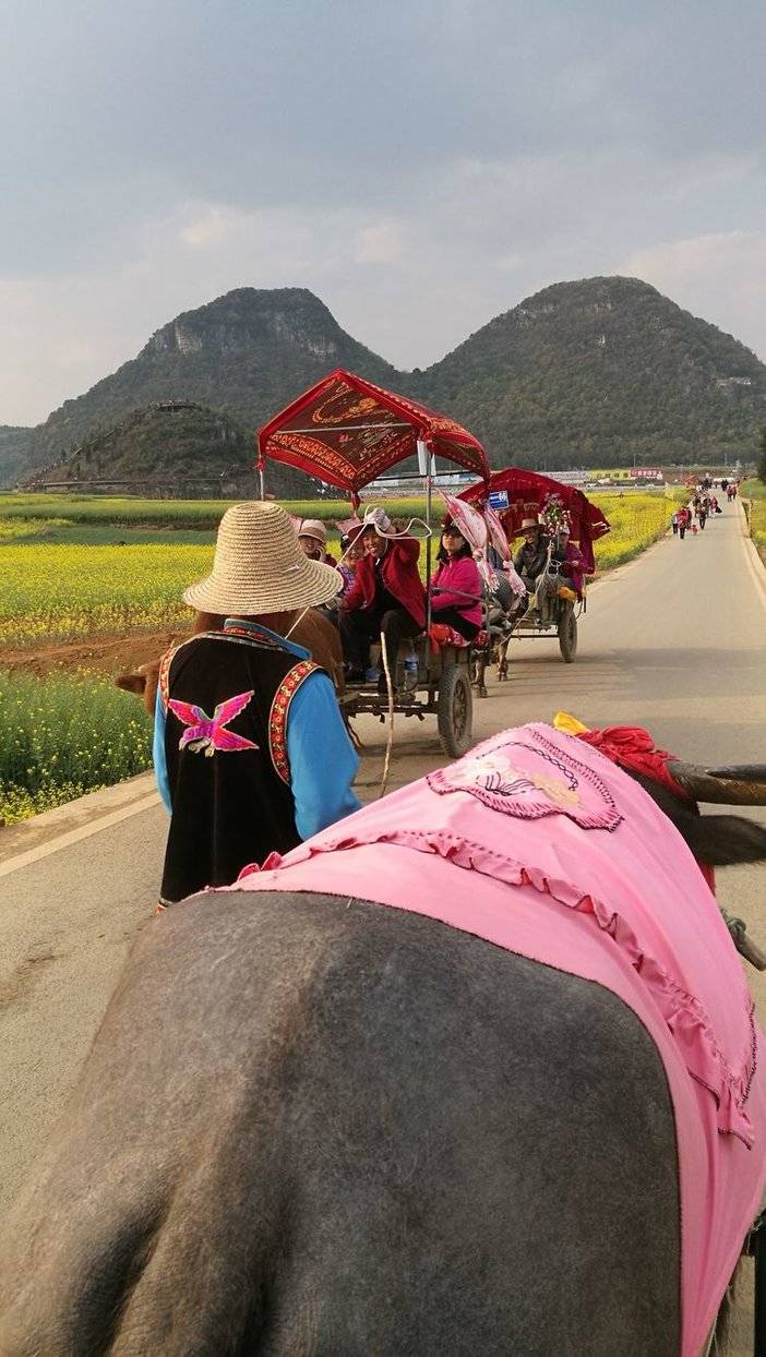 坐着布依族牛车游花海是颇受游客欢迎的方式。挑一条安静的道路进入花海深处。