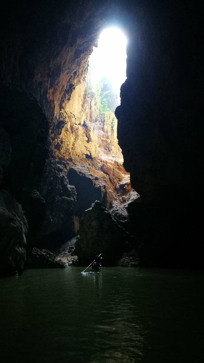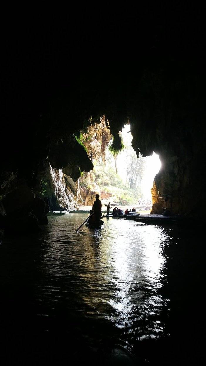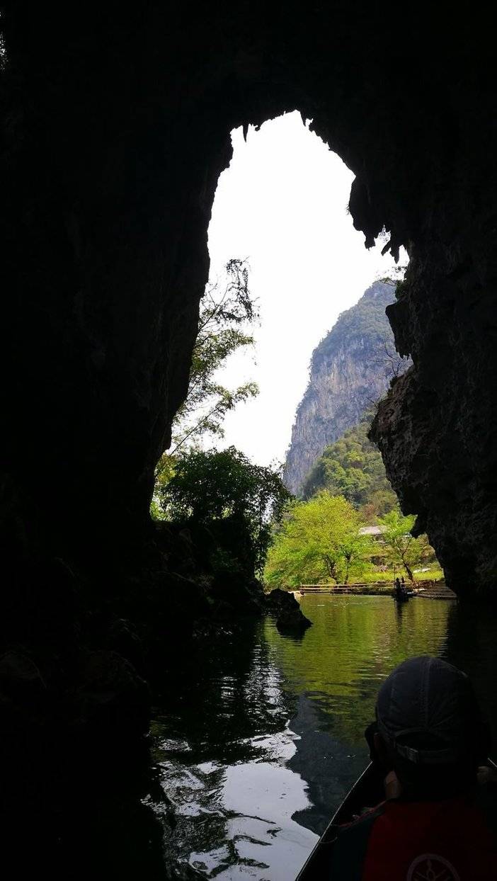 我们坐上了进洞的小船,小船晃晃悠悠的驶进山洞中,微风带来阵阵凉意,漆黑的洞里只有艄公帽子上头灯发出幽暗的灯光,外面喧哗声突然就消失了,连流水声也消失了,静悄悄的,只听见艄公撑船的竹竿入水声和石洞嘀嘀嗒嗒的滴水声。经过了三个天窗,二十多分钟后,看见前面有亮光,到洞口了。