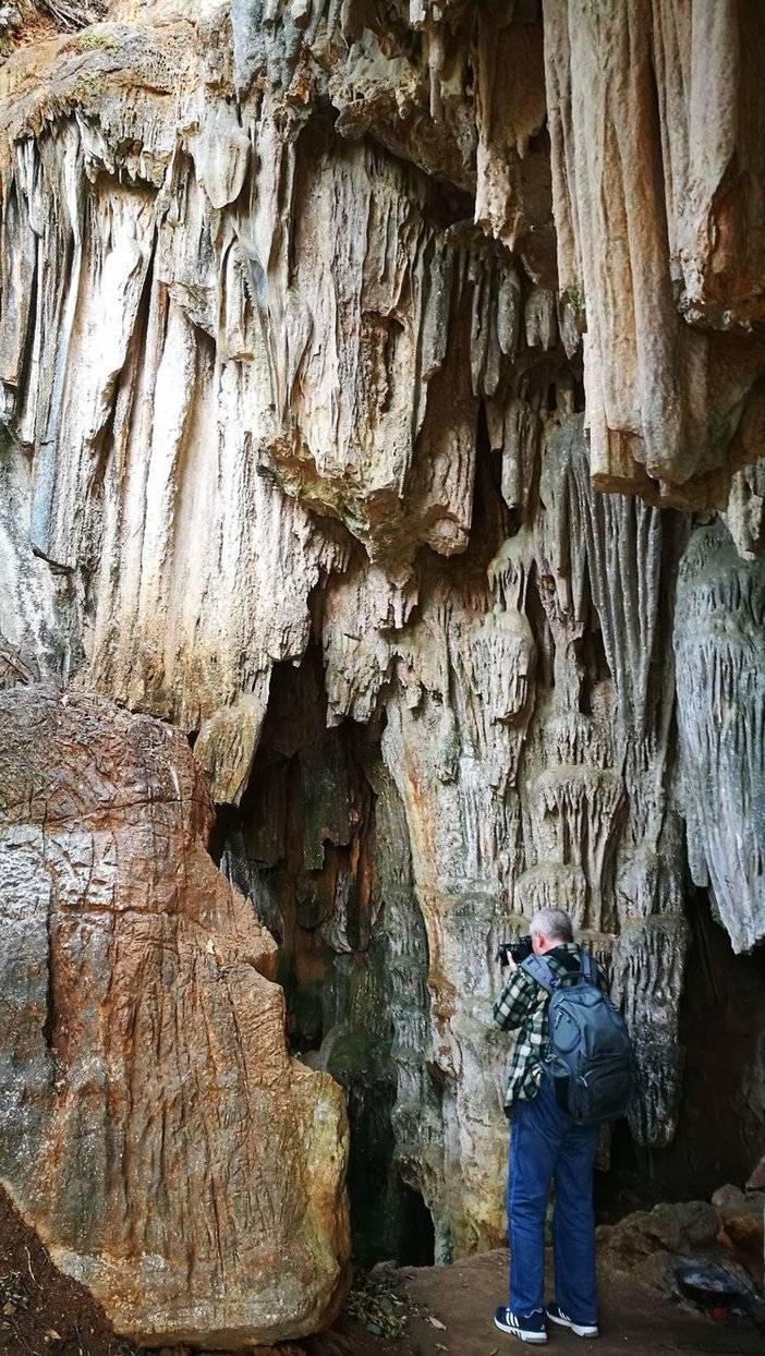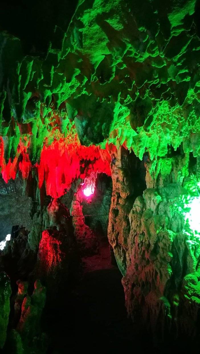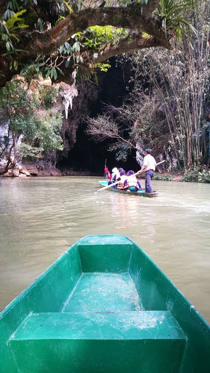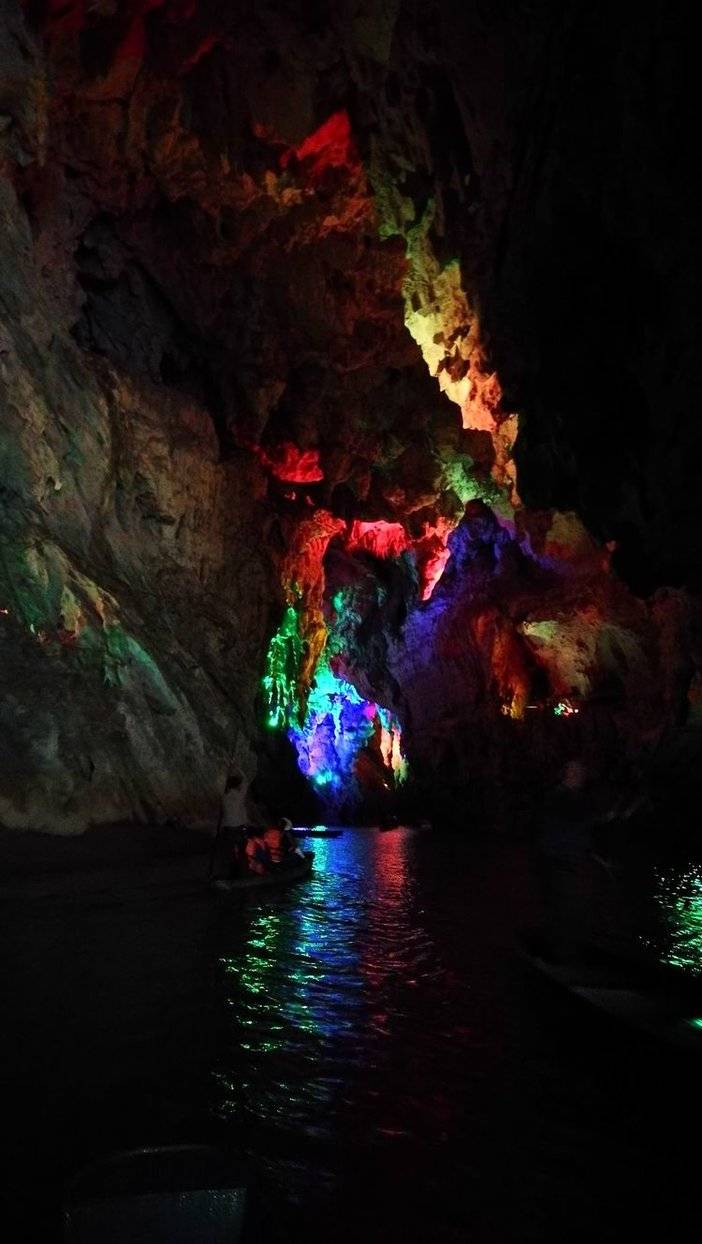 我们坐上了进洞的小船,小船晃晃悠悠的驶进山洞中,微风带来阵阵凉意,漆黑的洞里只有艄公帽子上头灯发出幽暗的灯光,外面喧哗声突然就消失了,连流水声也消失了,静悄悄的,只听见艄公撑船的竹竿入水声和石洞嘀嘀嗒嗒的滴水声。经过了三个天窗,二十多分钟后,看见前面有亮光,到洞口了。