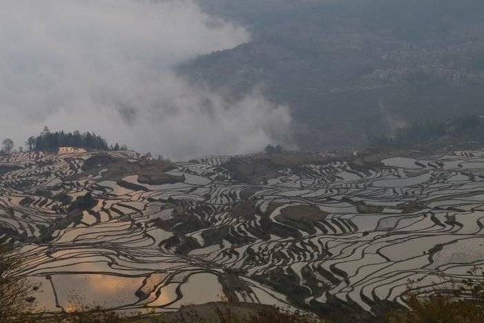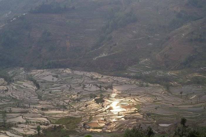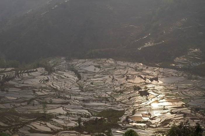 老虎嘴梯田~这里是元阳山势最险峻、气势最恢宏壮观的梯田,堪称“大地雕塑”的最高典范。群山之下的梯田,慢慢地随光褪去的变幻,美极了。尤其是倒影,真的就好像是上帝不小心打碎了一块镜子掉落在了人间一样。