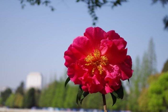 偶然发现一朵开得很美的山茶花,在湛蓝的天空下恣意开放,也不管有没有人注意她,欣赏她……