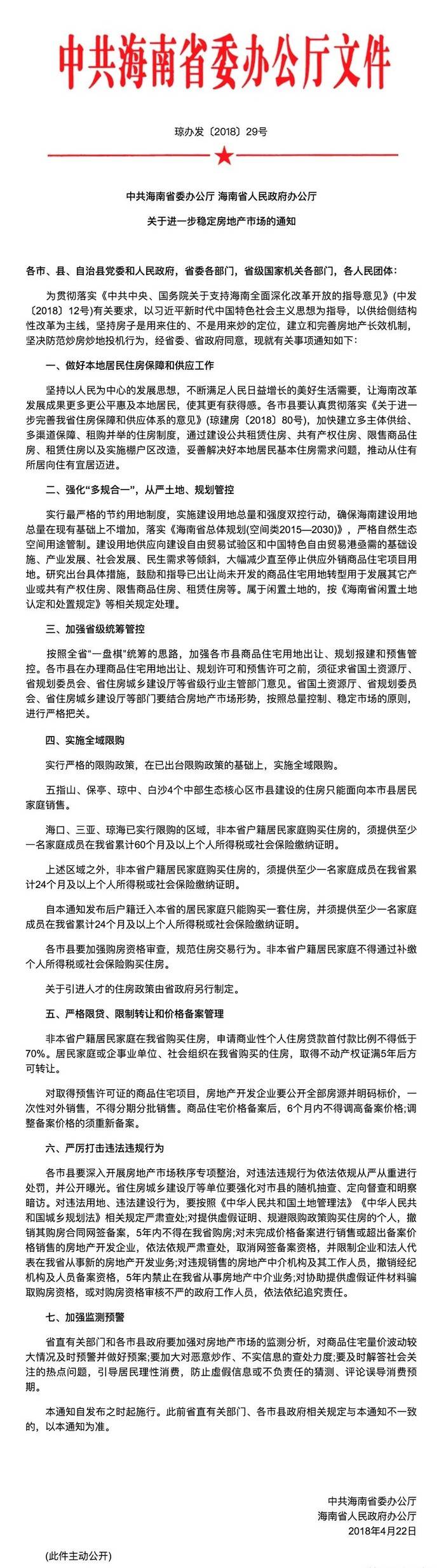 4月22日晚,海南省人民政府召开《中共海南省委办公厅 海南省人民政府办公厅关于进一步稳定房地产市场的通知》新闻发布会,发布严格的房地产限购政策,在已出台限购政策的基础上,商品住宅实施全域限购。
