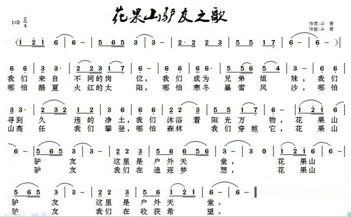 花果山驴友之歌》是花果山户外网的主题歌,由斗哥作词作曲。这首歌曲是进行曲节奏,曲调优美,极富动感与激情,歌词朗朗上口,歌颂了我们花果山驴友们的风采,唱出了我们大家的心声。这首歌曲将以大合唱的形式在今年花果山年会上演出,请大家积极学唱。我们还将在今后驴行途中教大家学唱这首歌曲。