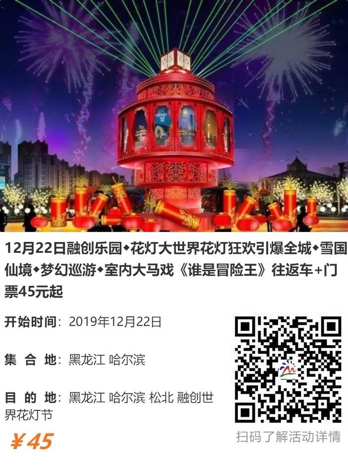 █12月22日融创乐园◆花灯大世界花灯狂欢◆引爆全城◆雪国仙境◆梦幻巡游◆室内大马戏《谁是冒险王》往返车+门票45元起【平房发车】