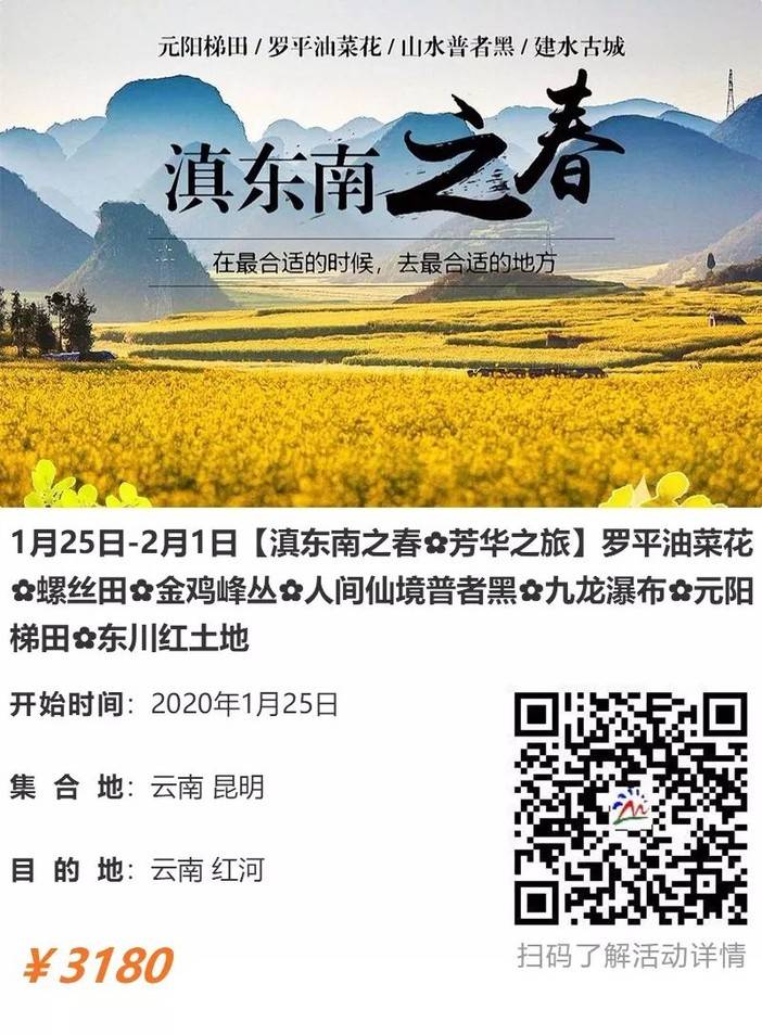 █1月25日-2月1日【滇东南之春✿芳华之旅】罗平油菜花✿螺丝田✿金鸡峰丛✿人间仙境普者黑✿九龙瀑布✿元阳梯田✿东川红土地✿8日深度摄影旅拍 【3180元昆明起止 湘江北去带队花果山独立团】