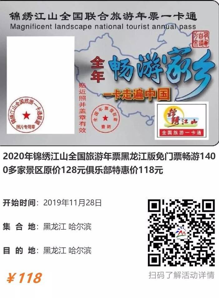 █2020年锦绣江山全国旅游年票黑龙江版免门票畅游1400多家景区原价128元俱乐部补贴会员后特惠价118元