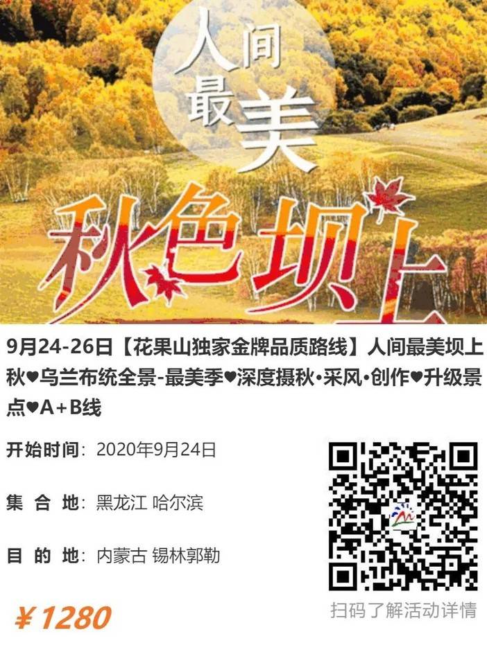 9月24-26日【花果山独家金牌品质路线】人间最美坝上秋乌兰布统全景-最美季深度摄秋·采风·创作升级景点A+B线可选/3-5日欢歌之旅【1280元/人(3日A线)+1880元/人(2日B线)含当地交通+标间住宿+门票+餐饮+保险】