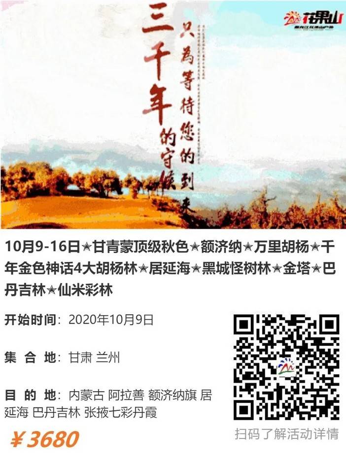 2.10月9-16日【纯玩品质8日】甘青蒙顶级秋色 额济纳 万里胡杨 千年金色神话 大胡杨林 居延海 黑城*怪树林 金塔胡杨林 巴丹吉林沙漠 七彩丹霞 仙米彩林 8日西夏王朝金秋行摄之旅【3680元含当地交通+门票+餐+住宿+保险】