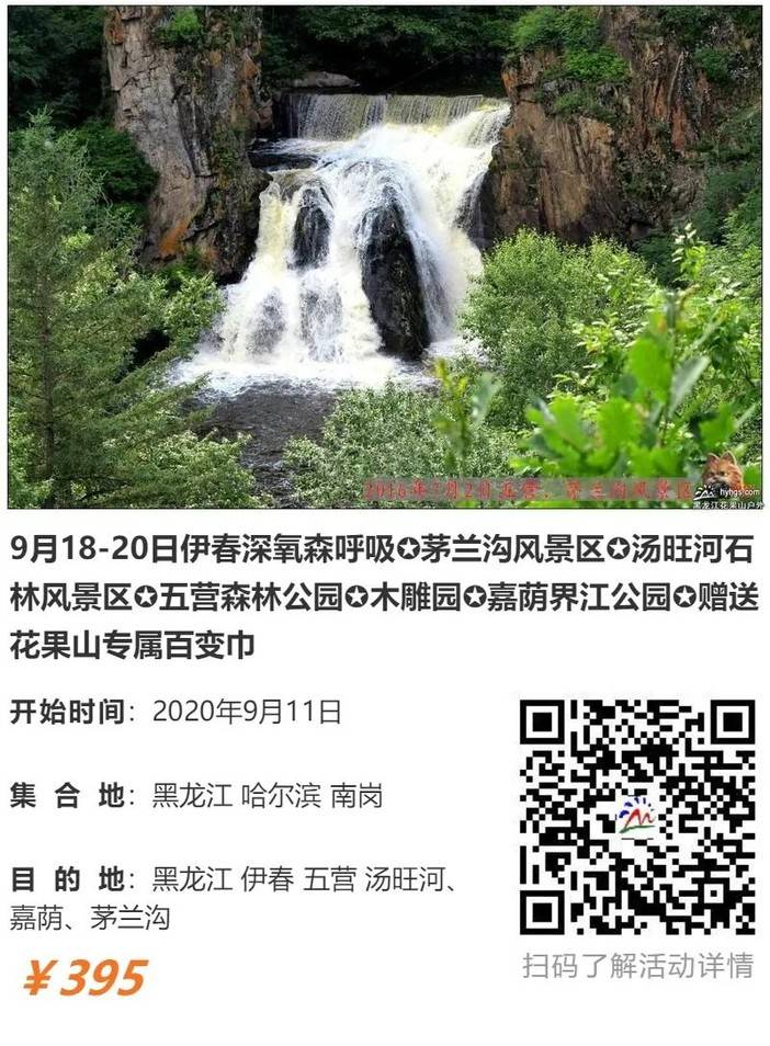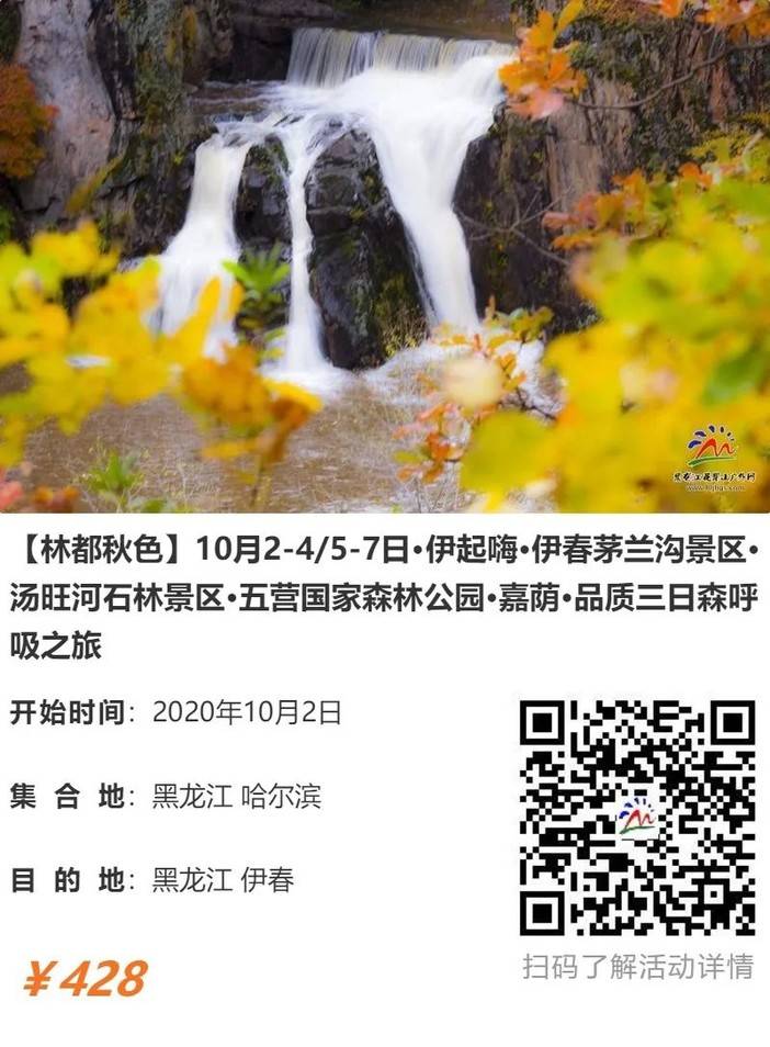 5.【林都秋色】10月2-4日、5-7日 伊起嗨 伊春茅兰沟景区 汤旺河石林景区 五营国家森林公园 嘉荫 木雕园 嘉荫界江公园 精品三日森呼吸游 送好礼精活动【428元含车费、2晚四星级宾馆、三正餐二早餐(正餐均为十菜一汤,晚餐提供酒水、户外保险】