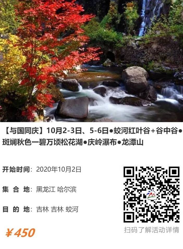 10月2-3日、5-6日【与国同庆】走进吉林●蛟河红叶谷+谷中谷●斑斓秋色一碧万顷松花湖●庆岭瀑布●龙潭山●顶级海鲜烤肉自助餐●两日欢畅之旅【450元含全程大巴+红叶谷景区门票+红叶谷中谷门票 +松花湖景区门票+电瓶车票+游湖船票+庆岭瀑布景区门票+宾馆双标独卫+2正1早餐含酒水以及庆岭活鱼宴+2天保险】