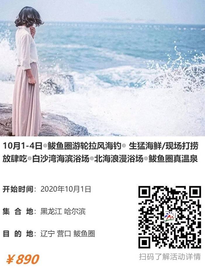 10月1-4日 鲅鱼圈游轮拉风海钓 生猛海鲜/现场打捞放肆吃 白沙湾海滨浴场 北海浪漫浴场 鲅鱼圈真温泉 鲅鱼圈最火网红海鲜自助高空玻璃桥 北海禅寺 红海滩 青龙山公园 全程奢华酒店 4日假日燃情放纵游【890元含全程大巴+宾馆双标+保险+网红海鲜自助餐+水上餐厅网红酒店+出海游轮现场打捞海鲜船上用餐+三个大酒店的正餐+鲅鱼圈自助水饺用餐+三早餐+鲅鱼圈温泉门票+北海出海游轮船票】