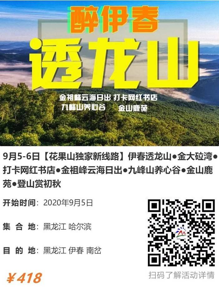 10月7-8日【花果山独家新线路】醉美伊春-透龙山●金大砬湾●青峰山峦●打卡网红书店●金祖峰观云海日出●九峰山养心谷●金山鹿苑●登山遛娃郊游●不二之选●两日游【费用418元一价全含:往返大巴+2正1早餐含酒水+宾馆标间独卫+金山鹿苑、金祖峰、九峰山养心谷、透笼山、金大砬湾门票+2日意外险】