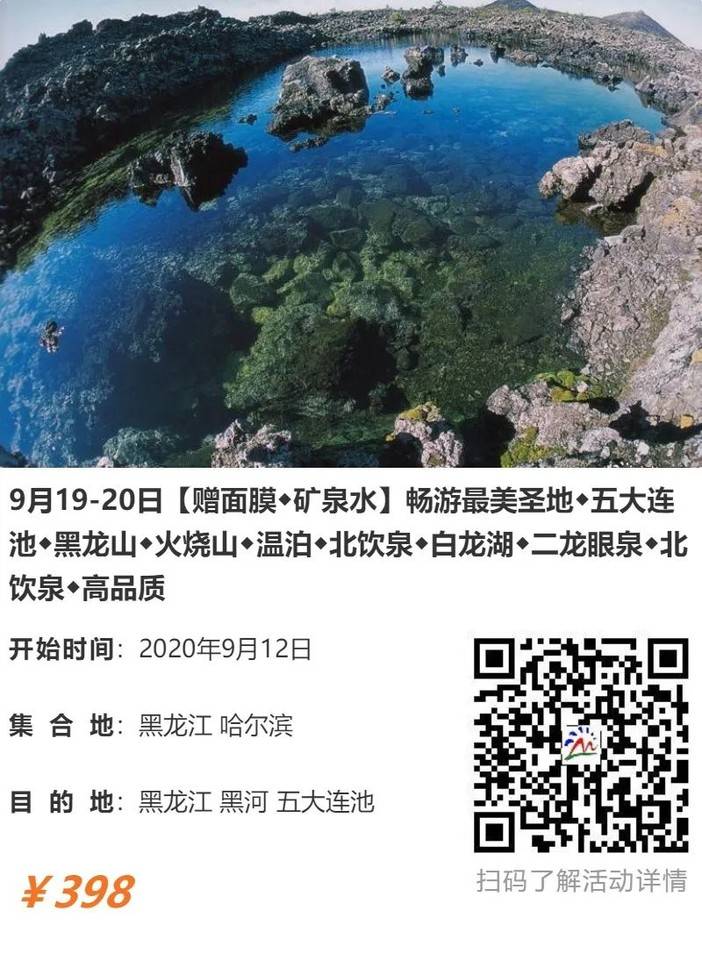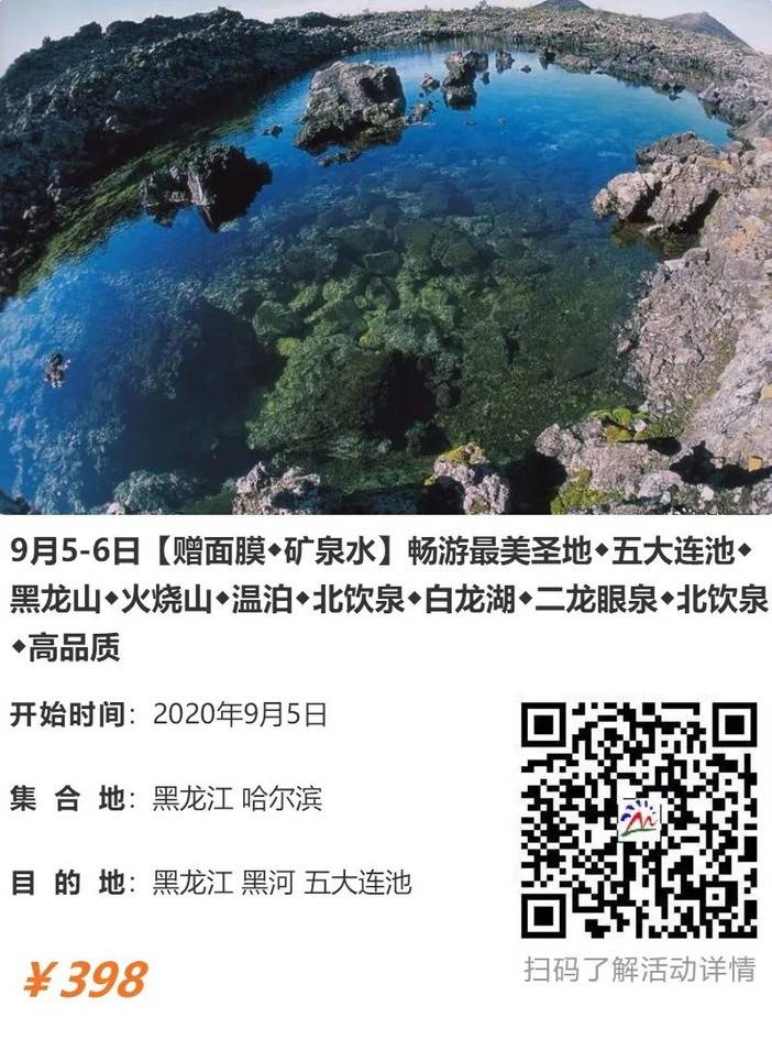 【正宗五大连池行程 必去核心景点老黑山】9月12-13/19-20/26-27日【赠面膜◆矿泉水】畅游最美圣地◆五大连池◆黑龙山◆火烧山◆北方九寨沟五彩温泊◆北饮泉◆白龙湖◆二龙眼泉◆北饮泉◆高品质【398元=车费+双标住宿+保险+2正1早餐+北饮泉、温泊、老黑山、火烧山门票】 独家赠送:体验五大连池森林高尔夫球和体验达翰尔族射箭,游览森林木屋等特色活动