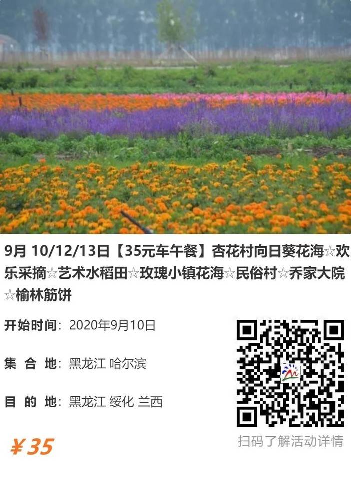 9月10/12/13日【35元车费+午餐】杏花村向日葵花海+艺术生态水稻田+玫瑰小镇花海+民俗村+乔家大院☆品榆林筋饼