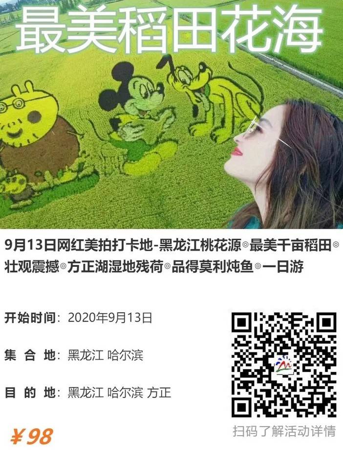 9月13日网红美拍打卡地-黑龙江桃花源◎最美千亩稻田◎壮观震撼◎方正湖湿地残荷◎品得莫利炖鱼◎一日游【98元=大巴+门票+正宗得莫利炖鱼+赠品】