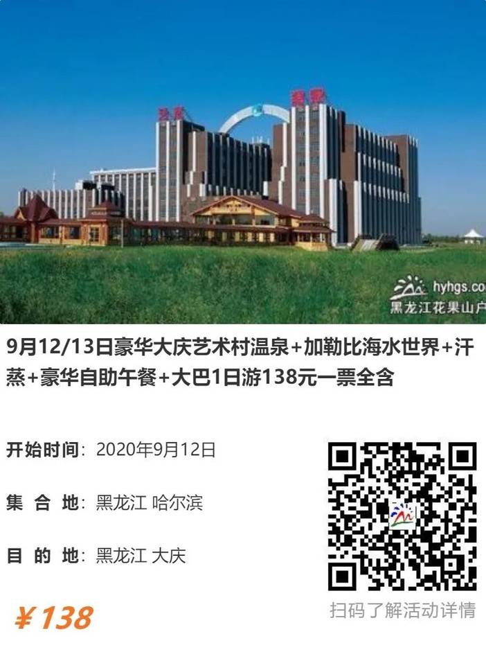 9月12/13日豪华大庆艺术村温泉+加勒比海水世界+汗蒸+豪华自助午餐+大巴1日游138元一票全含