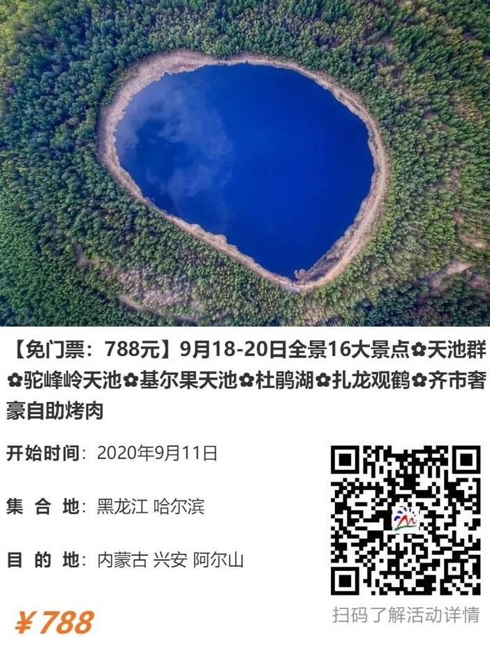 【阿尔山震撼价788元全含】【阿尔山景区免门票】9月/18-20/25-27日【花果山王牌品质线路★一价全含★无额外消费】中蒙边境巍巍兴安 梦幻童话-森林之城 阿尔山国家森林公园 天池群 驼峰岭天池 基尔果天池 杜鹃湖 石塘林 三潭峡 哈拉哈河 地池 山水岩壁画 扎龙湿地观鹤/龙凤湿地/齐市顶级奢豪自助烤肉*三日胜景仙踪之旅【788元/人=包含阿尔山风景区套票(免费)+环保车费+扎龙自然保护区门票+电瓶车费(72元))+两晚酒店双标住宿+大巴+3正餐2早餐(其中一餐为齐齐哈尔最好的顶级奢豪自助烤肉)+3日保险】
