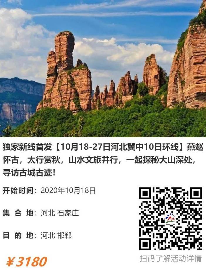 独家新线首发【10月18-27日河北冀中10日环线】燕赵怀古,太行赏秋,文旅并行,一起探秘大山深处,寻访古城古迹!(3180元含当地大巴+餐+宾馆标间+保险+门票:正定隆兴寺及四塔套票,于家石头村门票,苍岩山门票,嶂石岩套票,娲皇宫门票,响堂山石窟门票,白洋淀进淀船票,游船船票,野三坡百里峡门票,鱼谷洞门票,龙门天关门票,白石山门票+区间车)