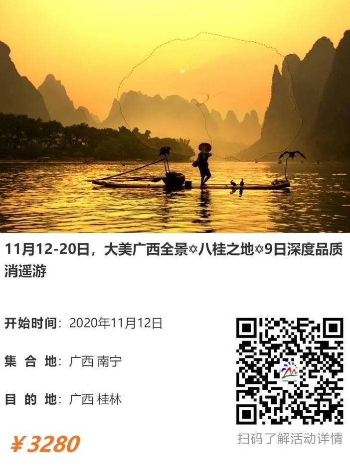 11月12-20日大美广西全景 八桂之地 9日深度品质消遥游【3280元包含当地车费+餐+宾馆+百魔洞、百鸟岩、德天大瀑布、象鼻山、银子岩、遇龙河漂流、骑行、漓江竹筏、程阳八寨、程阳桥、长桌宴、龙脊梯田、篝火、金坑梯田、资源八角寨等门票游船景交车、南宁至桂林高铁/动车票,景区内的特色表演(门票套票)+保险】