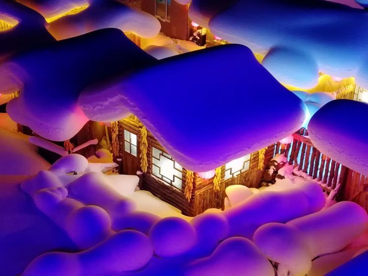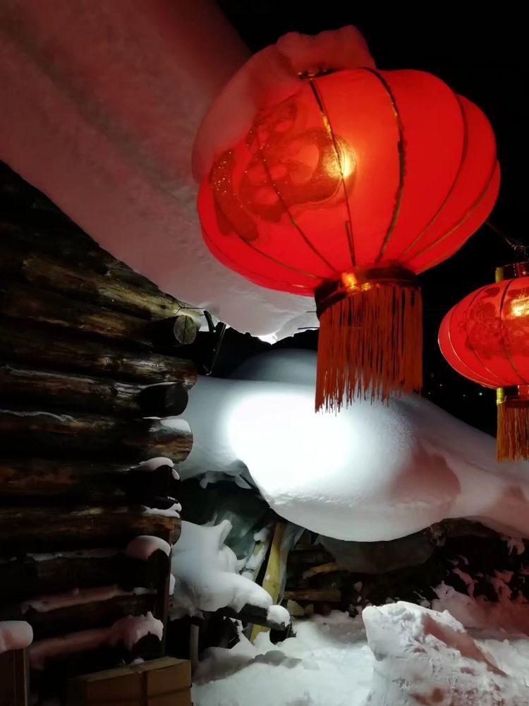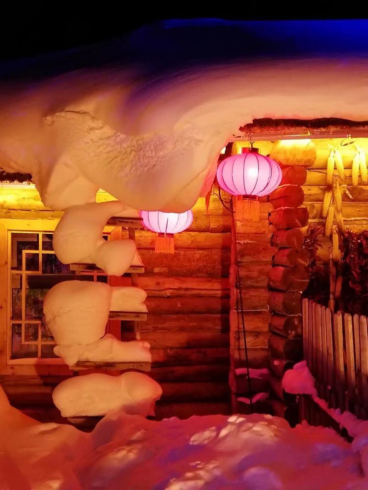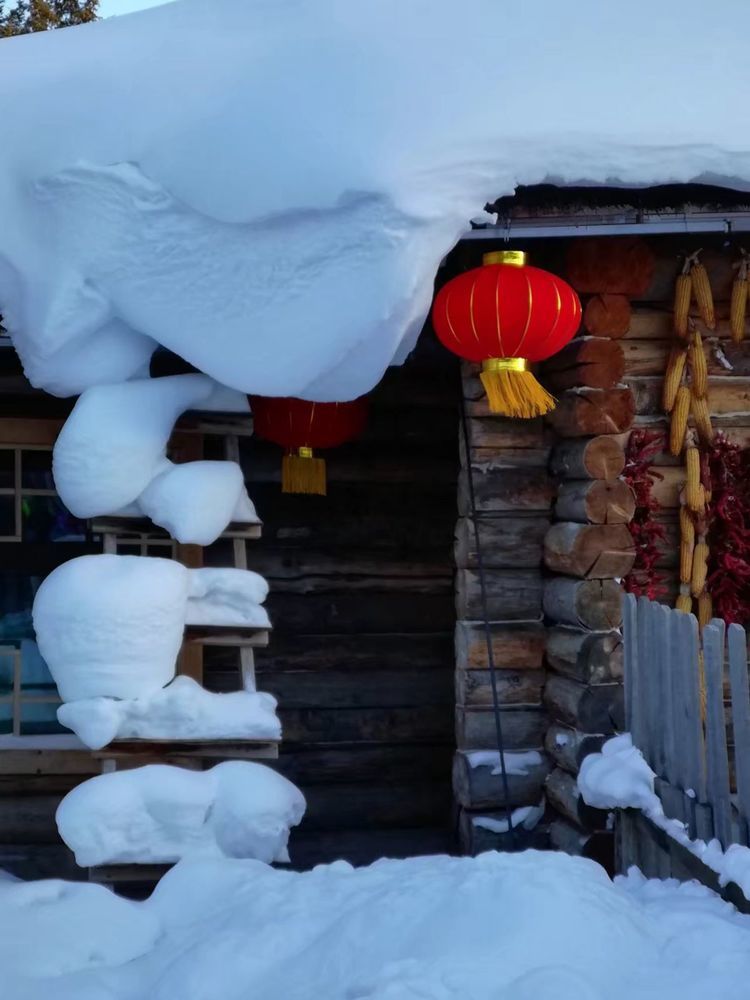进入雪乡,最先看到的就是家家户户房顶上突出来的雪檐……,雪檐大约有一两米宽,十几厘米来厚,伸出房檐几十厘米还低悬不落,像极了生日蛋糕上包裹着的厚厚的奶油。最有趣的是,有的雪檐竟然还会“空中拐弯”的技巧,一直垂到地上,和雪地长在了一起,于是就把房子严严实实地包起来,成了一个完整的雪屋。