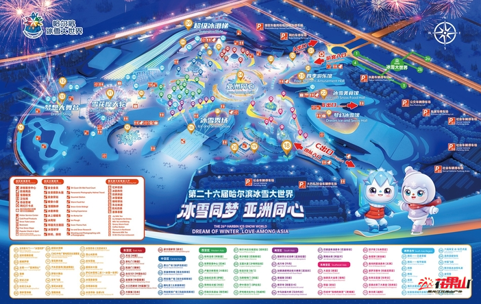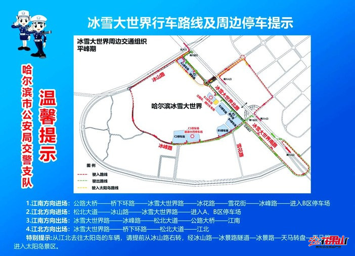 江南方向进场:公路大桥——桥下环路——冰雪大世界路——冰花路——雪花路——冰峰路——进入B区停车场。