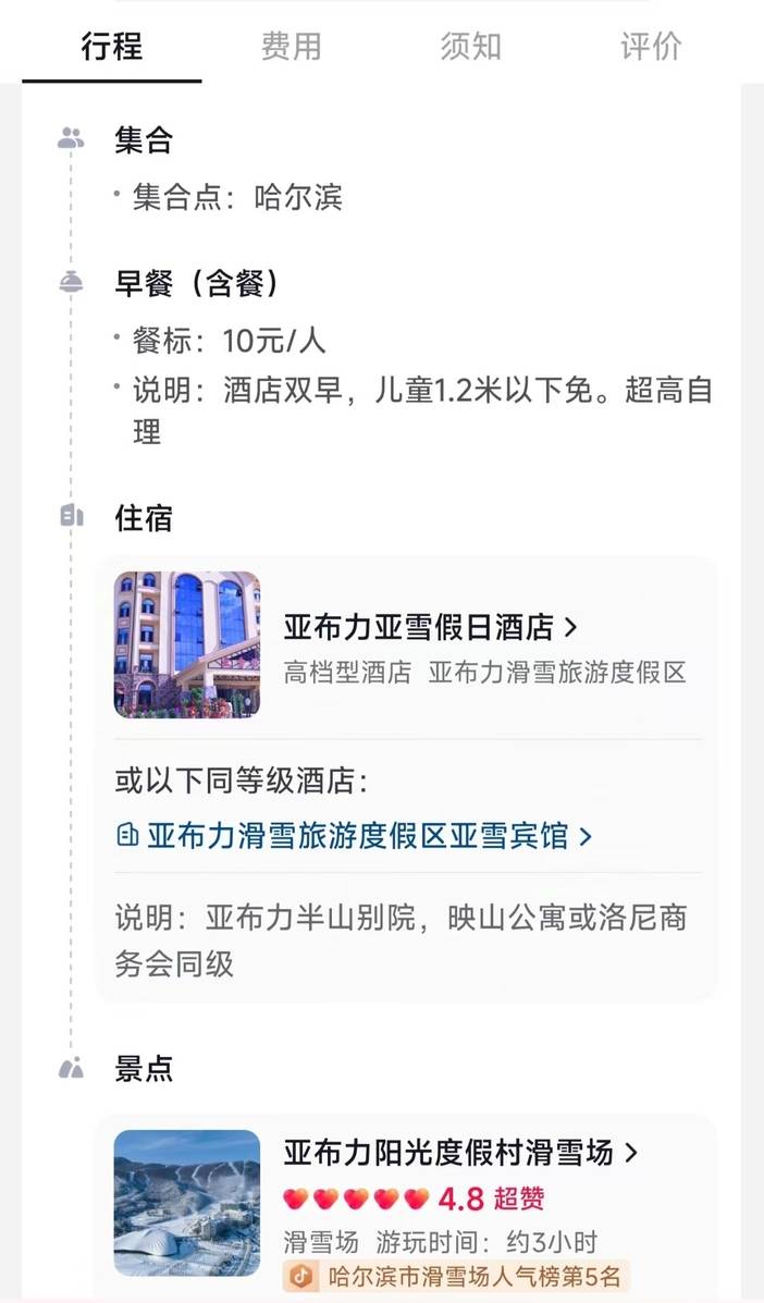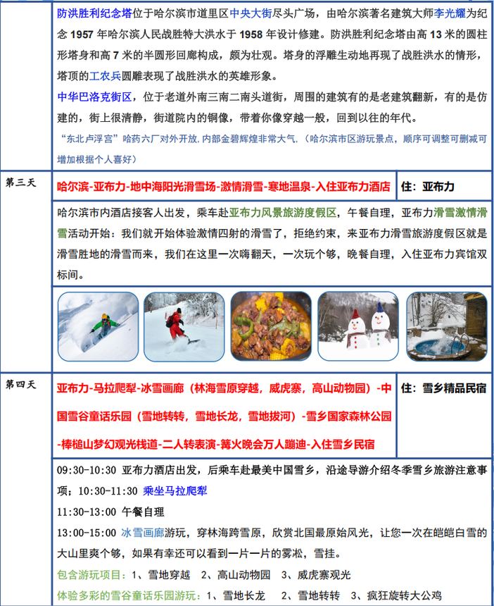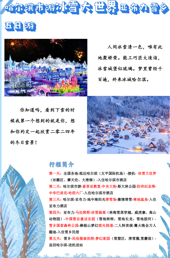 门票:冰雪大世界大门票(室外景区营业时间待定,如果12月17号前开园或者游客选择游玩室内冰雪小世界,则团费调整为和12月17价格一样)、亚布力滑雪场门票(包含雪鞋雪板雪仗)、雪乡大门票+倒站车、中国雪谷童话乐园、冰雪画廊、棒槌山观光栈道、马拉爬犁、二人转、梦幻家园、汉服/花棉袄拍照、雪地温泉、