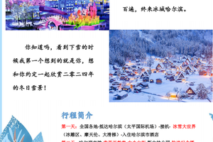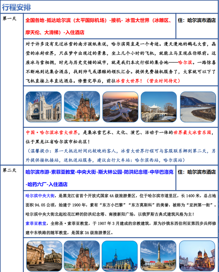 (温馨提示:第一天抵达时间比较晚的客人,冰雪大世界行程可挪到第二天,另外提供接站,送站服务,建议出行火车站:哈尔滨西站,哈尔滨站)